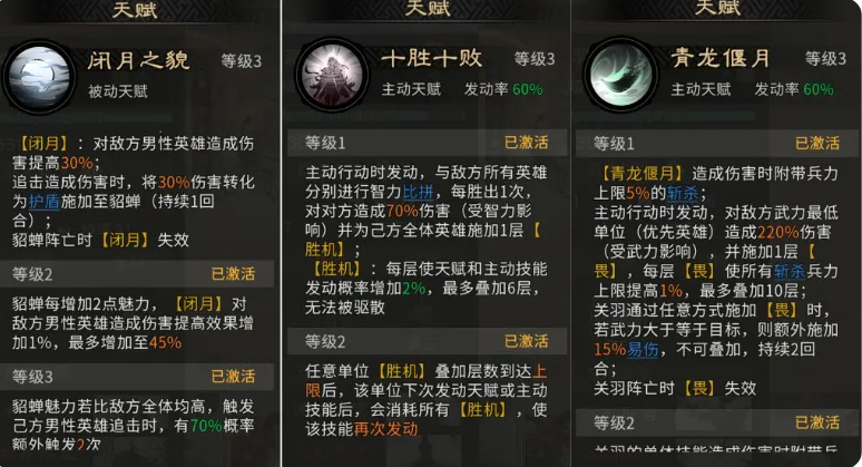 那么在这样站位的时候,大家注意貂蝉的天赋可以带来的是闭月之貌效果,通过这个天赋的能力,可以给对方的一些男性武将造成的伤害自然是会提升更多一些的,而另外利用貂蝉的追击造成一定伤害的时候,其中20%的伤害还可以变成其他的能力,这类能力对于貂蝉的效果来说是可以增加增益的,如果没增加魅力效果达到2点的话,根据这里的能力还可以得到增伤的数值,而在郭嘉的天赋效果上面带来的则是十胜十败,在其中根据他主动技能发动的一些能力,可以根据所有敌方的英雄拿到这里压制的效果。