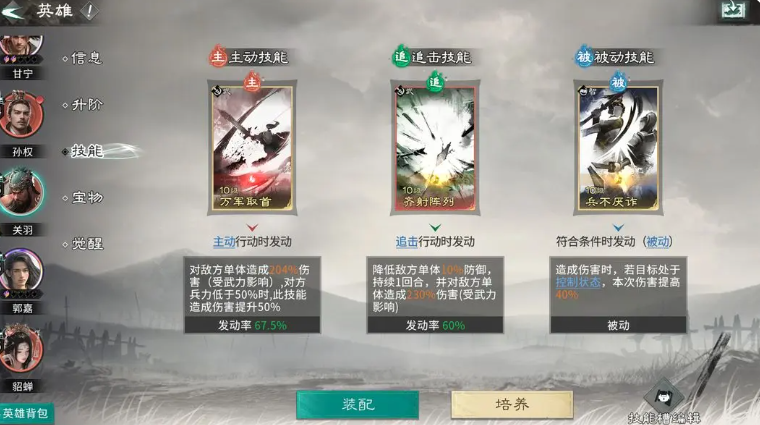 而藤甲兵的话同样是放前面,这上面大家要注意郭嘉他对于这几个兵种的需求没有那么高,而貂蝉的话不仅要踩到关羽的这个追击格子,还要踩到郭嘉的追击格子,这样的话可以二次进行释放技能,关羽的话就去踩貂蝉的追击格,这样的话可以根据毕业的效果带来天赋加成,因为这里关羽他可以触发自带的天赋,所以在其中根据不同的技能卡搭配的话,建议大家可以带万军取首作为一个主动技能,这样造成的单体伤害会让他的兵力低于50%的时候,自己的伤害提升50%。