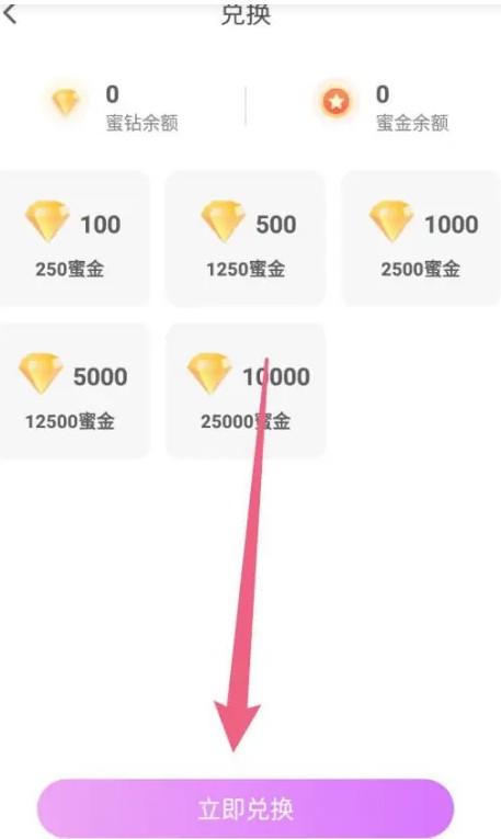 选择蜜金数量点击“立即兑换” ,如下图箭头所示