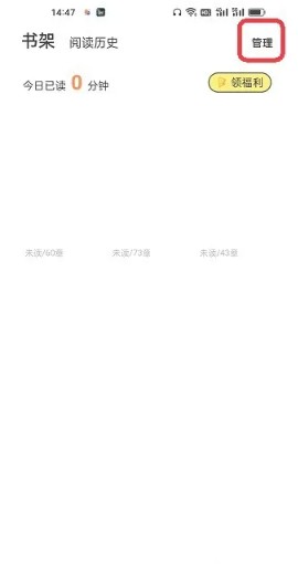 2、来到书架页面后,点击页面右上角的【管理】。