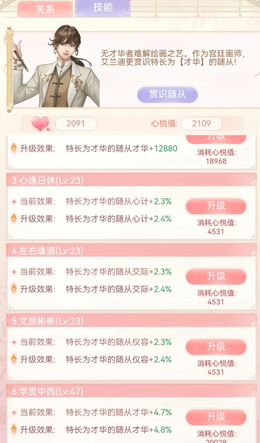 爱江山更爱美人游戏中的蓝颜都有不同的技能可以升级,选择最为合适的技能升级效果也会更强,阿里衮1~6技能随便点;弘历先点1-2技能,拿到天赋随从后也开始点3~6;艾兰迪和齐墨点1、2、6技能。