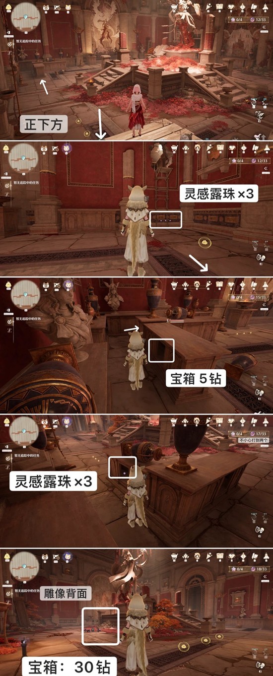 到升降台前:奇想星×3、灵感露珠×30、宝箱×1(5钻)、阅读物《作者不明的日记·其二》、唱片《落日的余晖》升降台周围三层+顶层:奇想星×4、灵感露珠×33、唱片《直面往昔复涌》