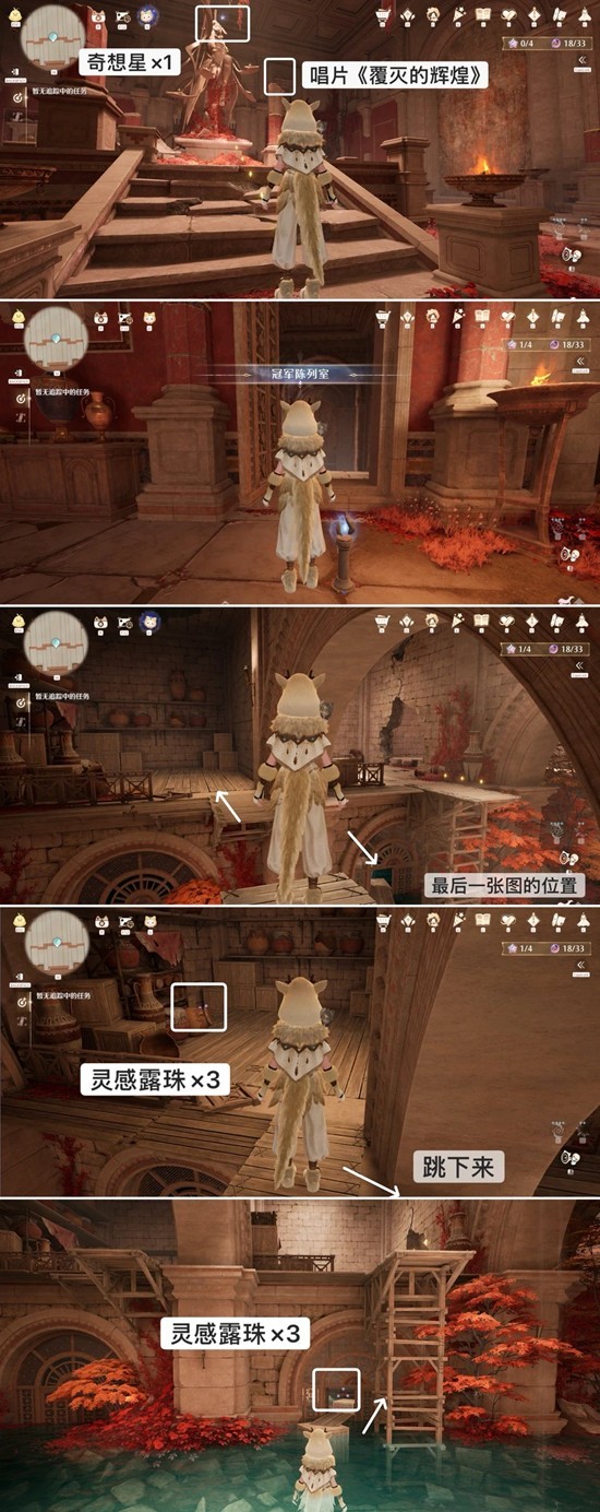 走到【冠军陈列室】(探索完雕像房间):奇想星×1、灵感露珠×18、宝箱×2(35钻)、唱片《覆灭的辉煌》