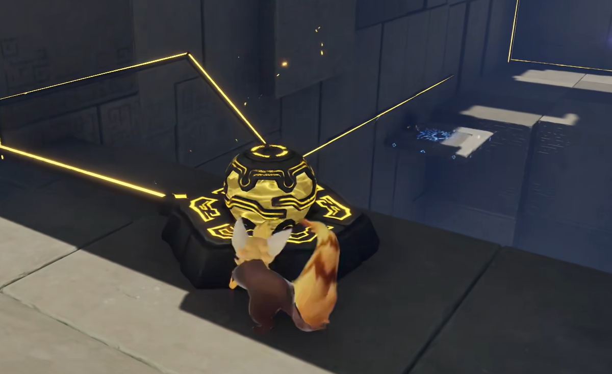 该地宫坐落于闪电之森正下方。初始区域中央电路呈断开状态,两节点间被木箱阻隔。玩家需操纵紫色电箱撞击木箱使其移位,随后将电箱精准置于两个节点之间,完成通路连接,前方闸门随即开启。首个宝箱即藏于该紫色电箱后方平台处。