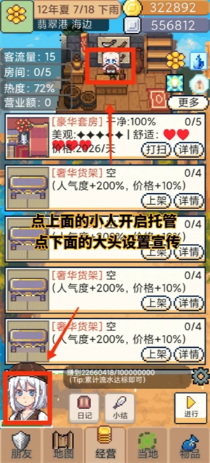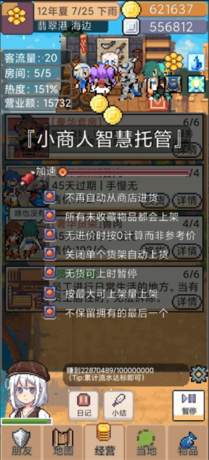 4、点上面的小人开始托管,把图中选项点满,还可以拖动加速按钮,点下面的开始按钮。