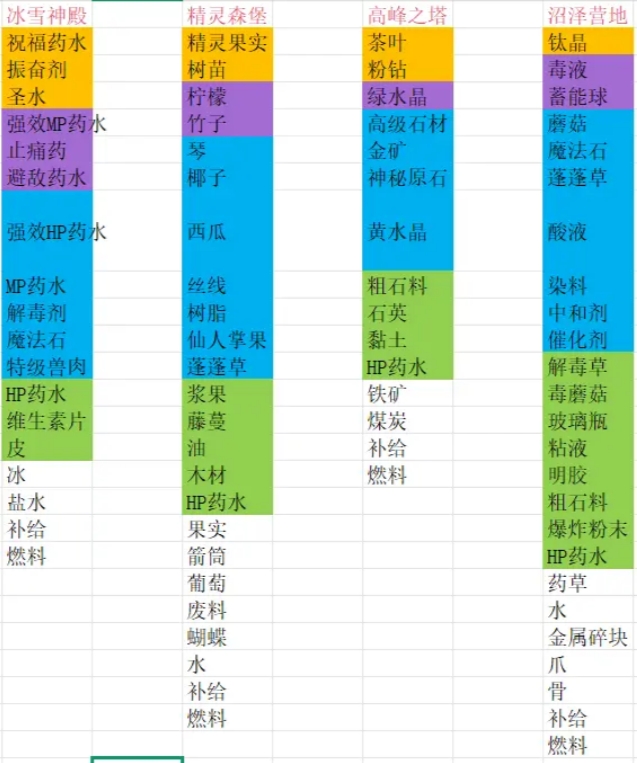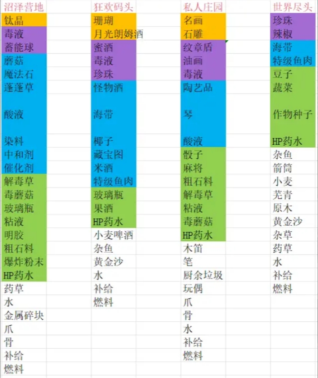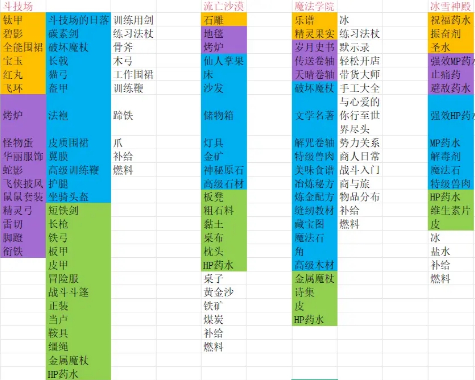 以下表格的物品颜色标注为稀有度