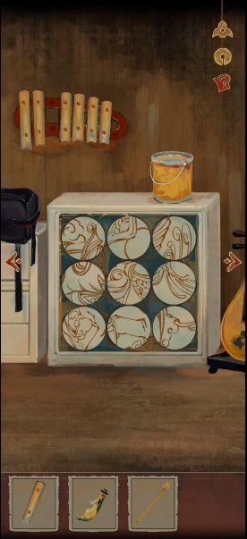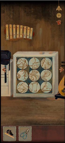 12、我们把两个琴键安装到钟琴上,用刀柄敲击钟琴,密码:35784,拿起掉落的剪刀。