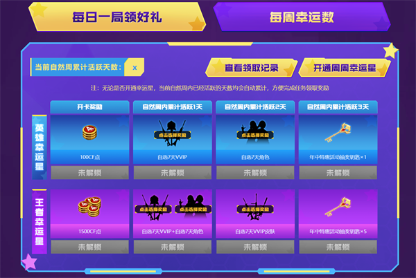 无论是否开通幸运星,当前自然周内已经活跃的天数均会自动累计,方便完成任务领取奖励。