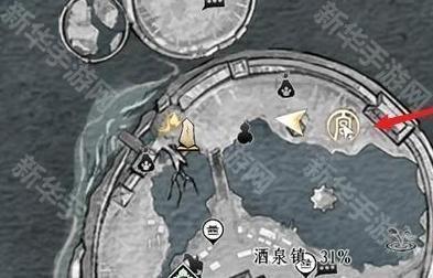 3、接取任务后,我们需要先打开地图,在酒泉镇图中箭头处标记位置