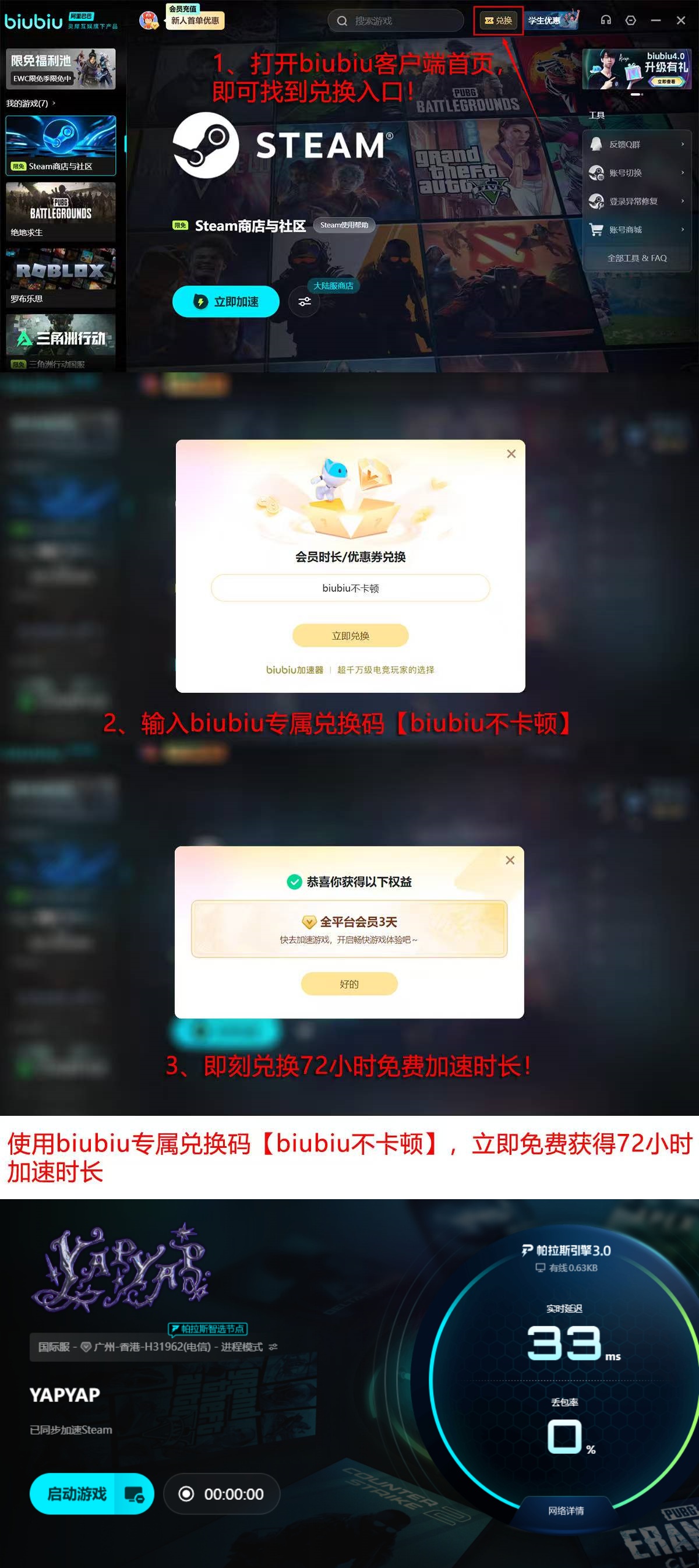 新用户首次启动biubiu加速I器时,系统将自动发放24小时免费加速时长。若需延长体验周期,可在设置界面输入兑换码【biubiu不卡顿】,成功核验后即可额外获得3天全功能使用权。