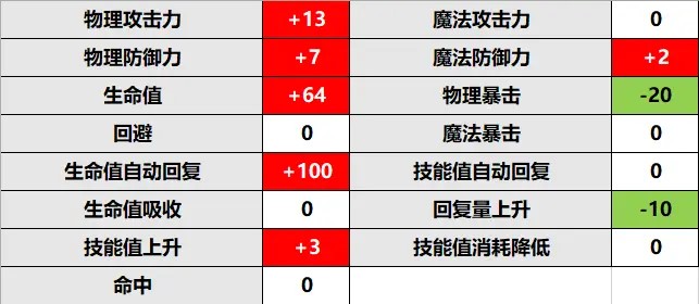 rank12>rank11的属性:物理攻击力,物理防御力,魔法防御力,生命值,生命值自动回复,技能值上升