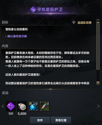 任务属于远征队任务,只要账号任一角色完成即可解锁星辰护卫地牢玩法,很多玩家接取任务后无法通过查看位置找到任务NPC,是因为该任务可以在大陆中的任一处大陆的星辰护卫NPC处完成因此没有指定固定位置。
