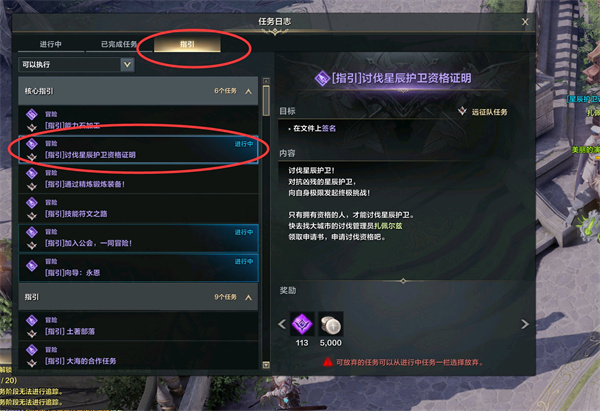1、按快捷键【J】打开任务系统,在指引任务中找到讨伐星辰护卫资格证明并接取任务;