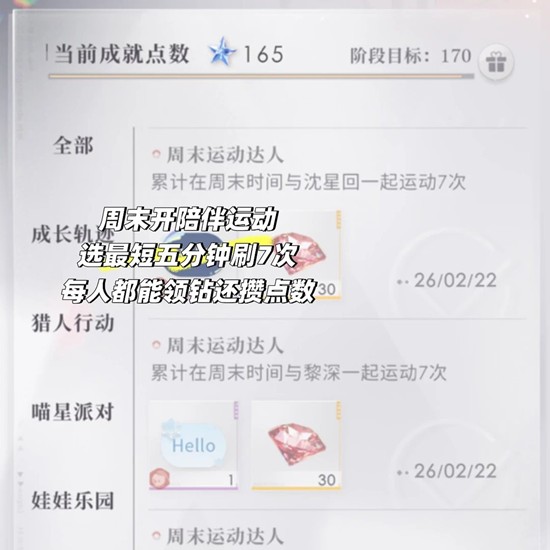 薅钻3: 找个周末,陪伴运动选5分钟,每个人7次,一共也就一个人35分钟。就可以领成就点数的150钻石,以及双倍星星的100钻。