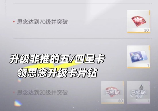 薅钻4: 升级非推的五星or四星卡到20级就好,可以薅卡片钻石。以及用这些20级卡片刷个定向轨到10-20轨,还能再捞一波战斗钻石。