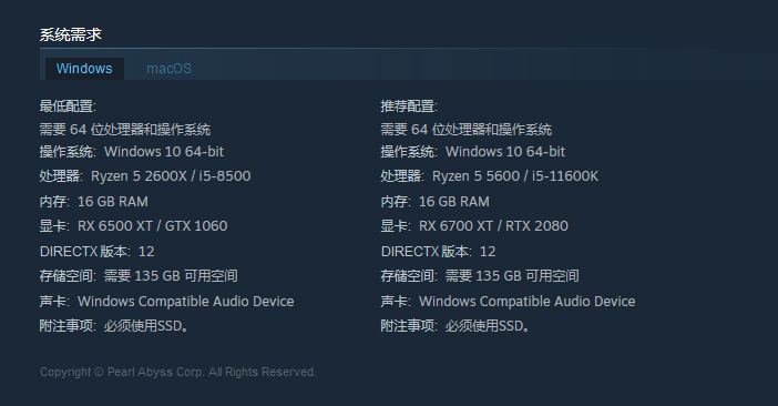 根据官方公布的最低与推荐配置,游戏对硬件门槛设定明确:最低需Intel Core i5-8400或AMD Ryzen 5 2600处理器,搭配NVIDIA GTX 1060 6GB显卡;推荐配置则要求Intel Core i7-9700K或AMD Ryzen 7 3700X,显卡需达到NVIDIA RTX 3070或AMD RX 6800级别。内存方面,最低8GB,推荐16GB;存储空间需预留至少120GB SSD空间。上述数值为保障基础运行与高画质模式流畅体验的硬性指标,不可降低。
