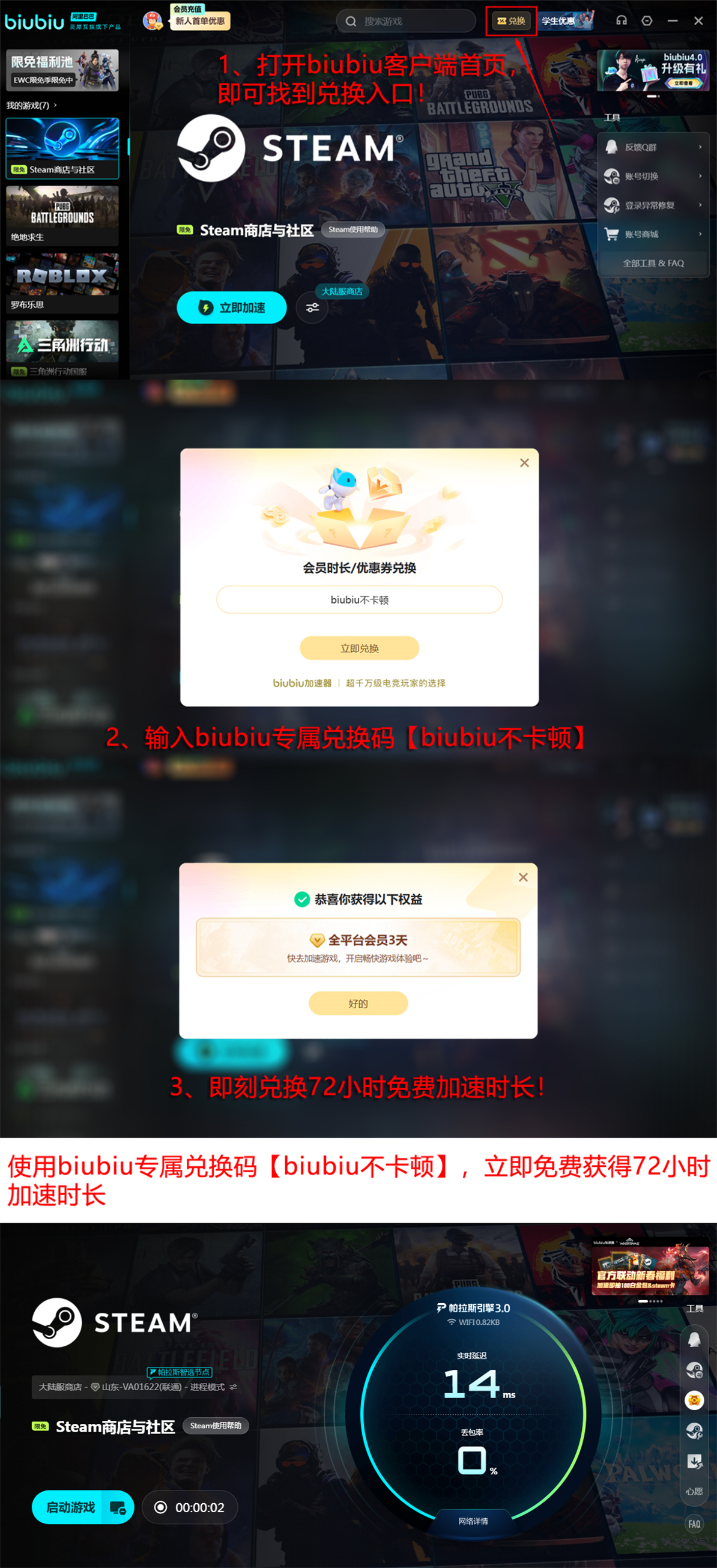 新用户注册后可获赠24小时免费加速时长,另附专属兑换码【biubiu不卡顿】,单账号限用一次,可额外兑换72小时服务。两项权益叠加,首登即享总计96小时无中断加速支持。