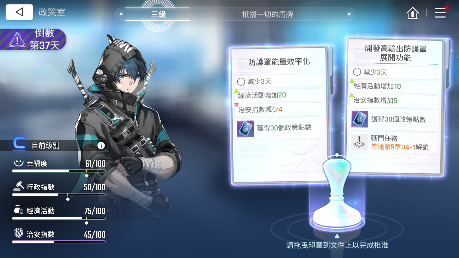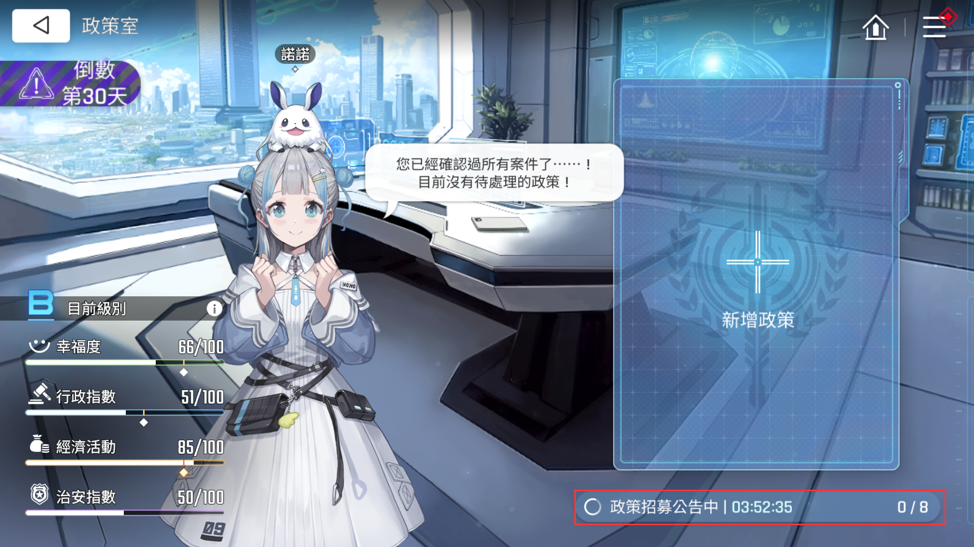 所有商品均以“政策点数”为唯一兑换货币,该代币仅能通过政策室任务稳定获取。政策室会周期性触发倒计时型灾难事件,玩家需在限定时间内完成对应政策目标。每次任务需同步保障行政指数、经济活动、治安指数三项核心指标达标,而提交政策报告书正是达成指标与获取点数的双重手段。当前任务奖励档位明确划分为20点与30点两类政策点数,结合任务难度与资源回报率进行梯度选择,是提升单位时间收益效率的核心方法。