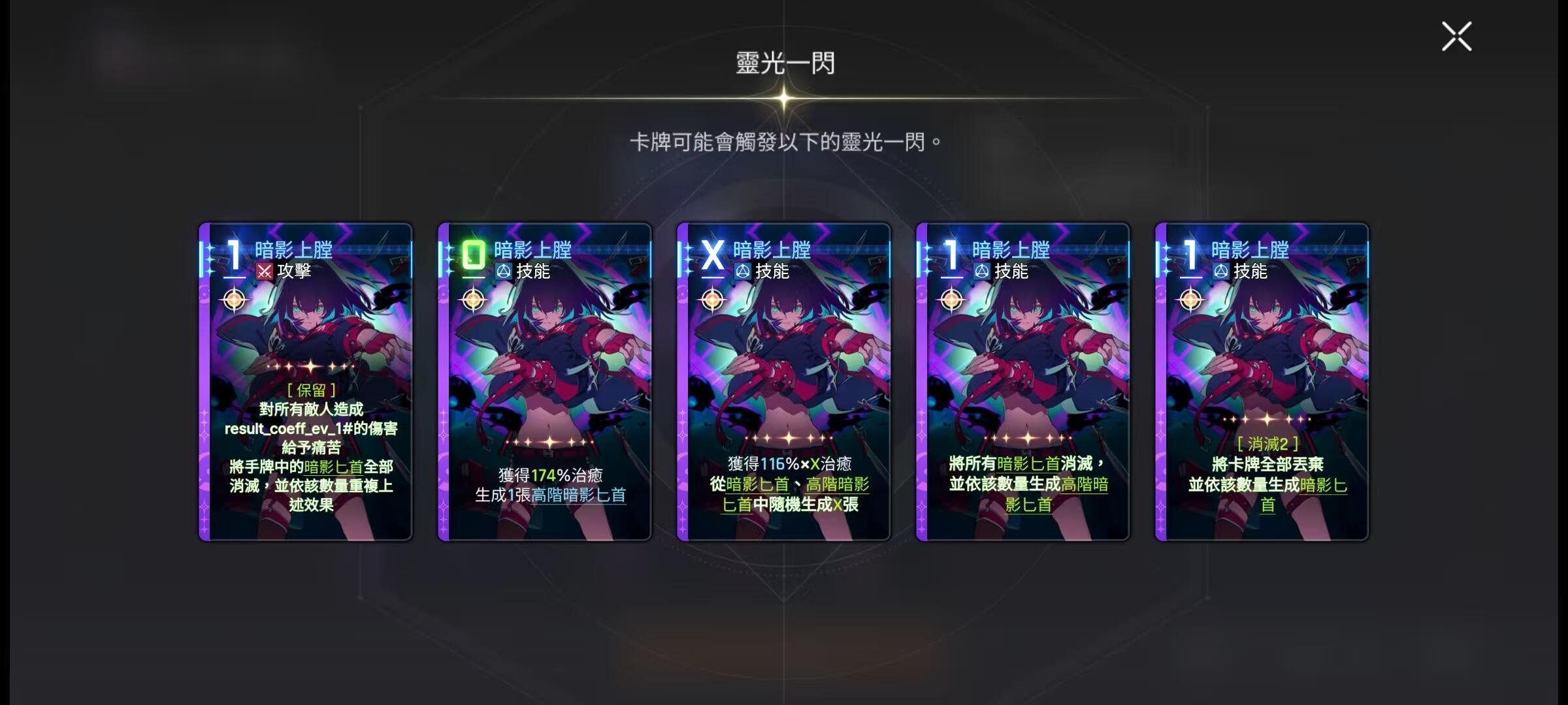 特蕾莎的卡牌“暗影上膛”是该流派战术基石。其效果为:当自身受到技能类治疗时,立即生成一张1阶1费的暗影匕首。该匕首不仅可直接攻击,还会为目标施加“痛苦”状态,每回合造成固定数值的持续伤害。由于费用极低且触发条件明确,此卡大幅提升了单位费用下的技能释放频次与总伤害量。实战中需优先强化该卡,确保其稳定触发,否则易导致匕首数量不足,中断输出节奏。