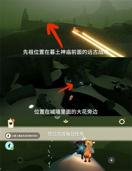 先祖位置在暮土神庙前面的远古战场,进入远古战场后直接往城墙上飞,可以看见先祖位置在城墙内的大花旁边