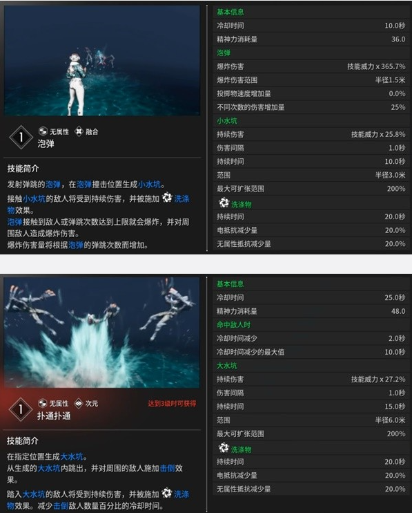 ①泡弹(融合):向前方发射泡弹,在弹出的位置与自己所在的位置生成一个小水坑。小水坑内的敌人将受到持续伤害,并成为洗涤物。