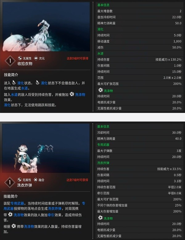 ③收拾衣物(次元):进入液化状态。在液化状态下,无法离开地面,也无法使用技能,但可穿过敌人,并使移动速度和防御力增加。在液化状态下移动时,可对敌人造成持续伤害,并生成使敌人成为洗涤物的水道。