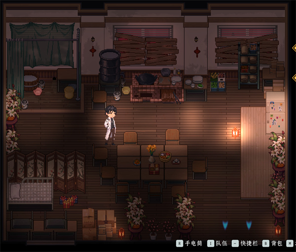 罐子右边是灶台,做饭在这边,你的饱食度来源,没点出来之前就只能靠箱子里面摸出来的压缩饼干或是之前买的饭菜过日子。