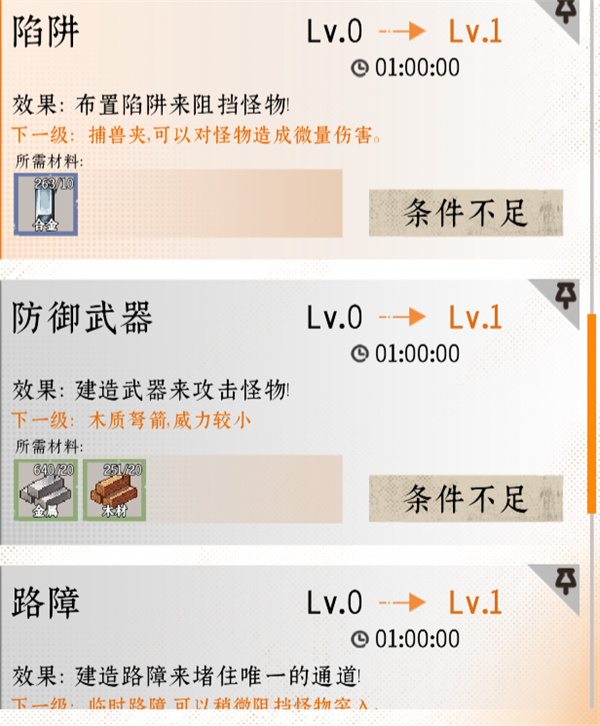 三层和四层没什么好说的,修补好会让环境好一些没那么瞎眼,第二层走廊在修好后,在科技树能点出相关的防御设施,在设施建好后,有概率会在晚上22点触发怪物攻城,击退有奖励,以及结束后记得修补防御设施。