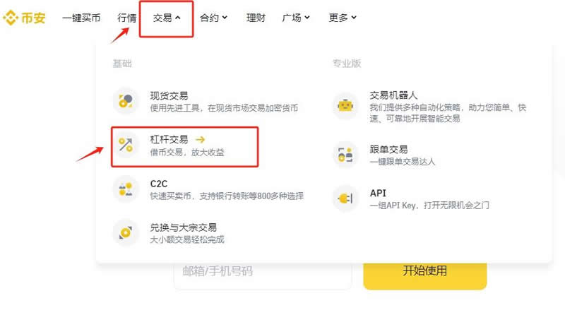 1. 访问币安官网完成登录(新用户需先注册),通过顶部导航进入【交易】-【杠杆交易】界面。