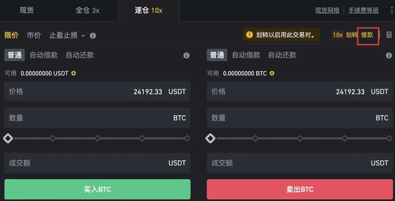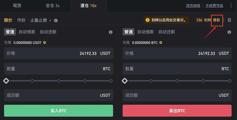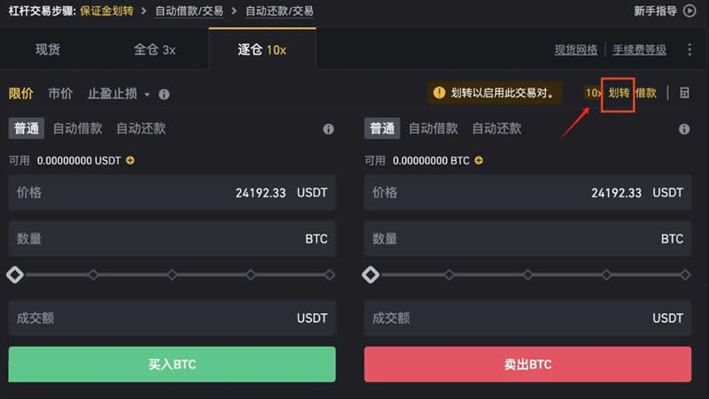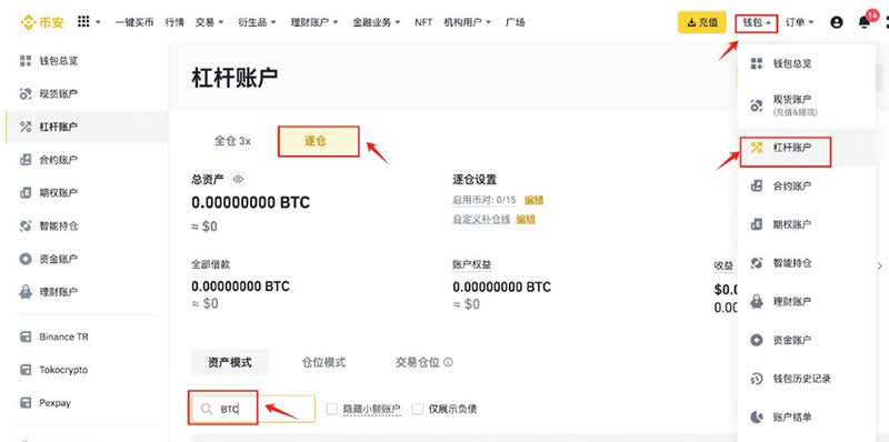 在转入杠杆币对资产后,系统会显示为待开仓状态。实际仓位建立需通过手动或自动借币产生负债。下面以币安平台BTC交易为例,详解具体操作步骤: