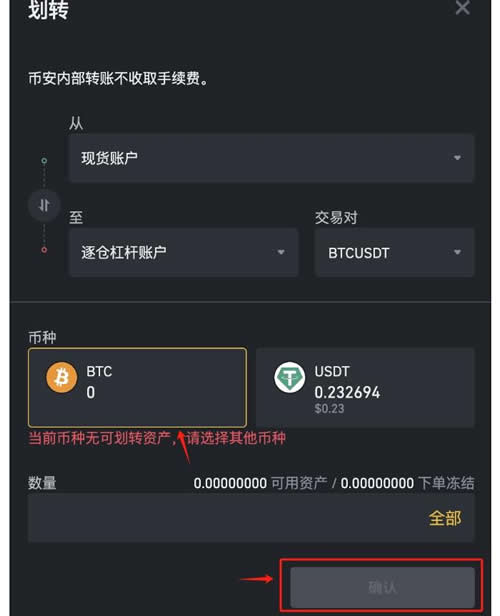 4. 在转账界面确认将资产从"现货账户"转至"逐仓账户",选择对应币种和数量后点击确认。