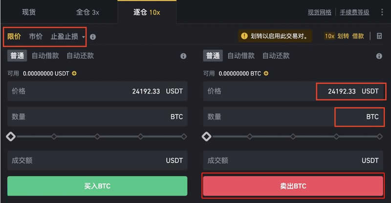 7. 若预判行情下跌,可通过借币高价卖出后低价回购获利。具体操作包括选择订单类型、设定交易模式为【普通】,填写卖出价格与数量后执行交易。