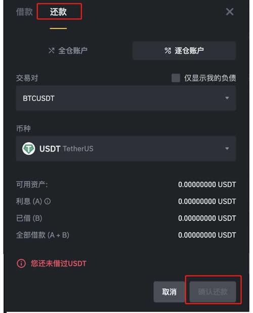 9. 切换至【还款】页签,选择对应币种和还款金额后完成还款操作。