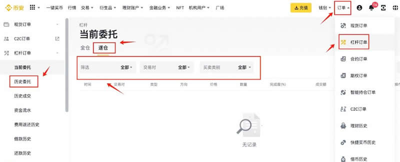 11. 在【订单】-【杠杆订单】界面可查询历史委托记录,支持按时间、交易对和买卖类型筛选。