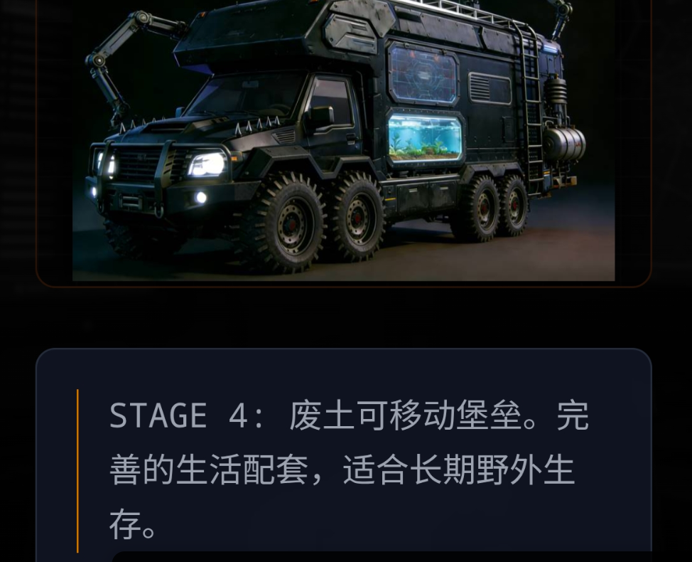 车辆改造系统是本作的核心特色之一。初始载具为一辆基础皮卡,玩家可逐步加装撞角强化近战防护,铺设太阳能电池板构建可持续能源体系,并搭建水培种植舱实现食物自主生产。该模块融合工程逻辑与策略规划,强调玩家在资源约束下的空间决策能力与功能适配思维。