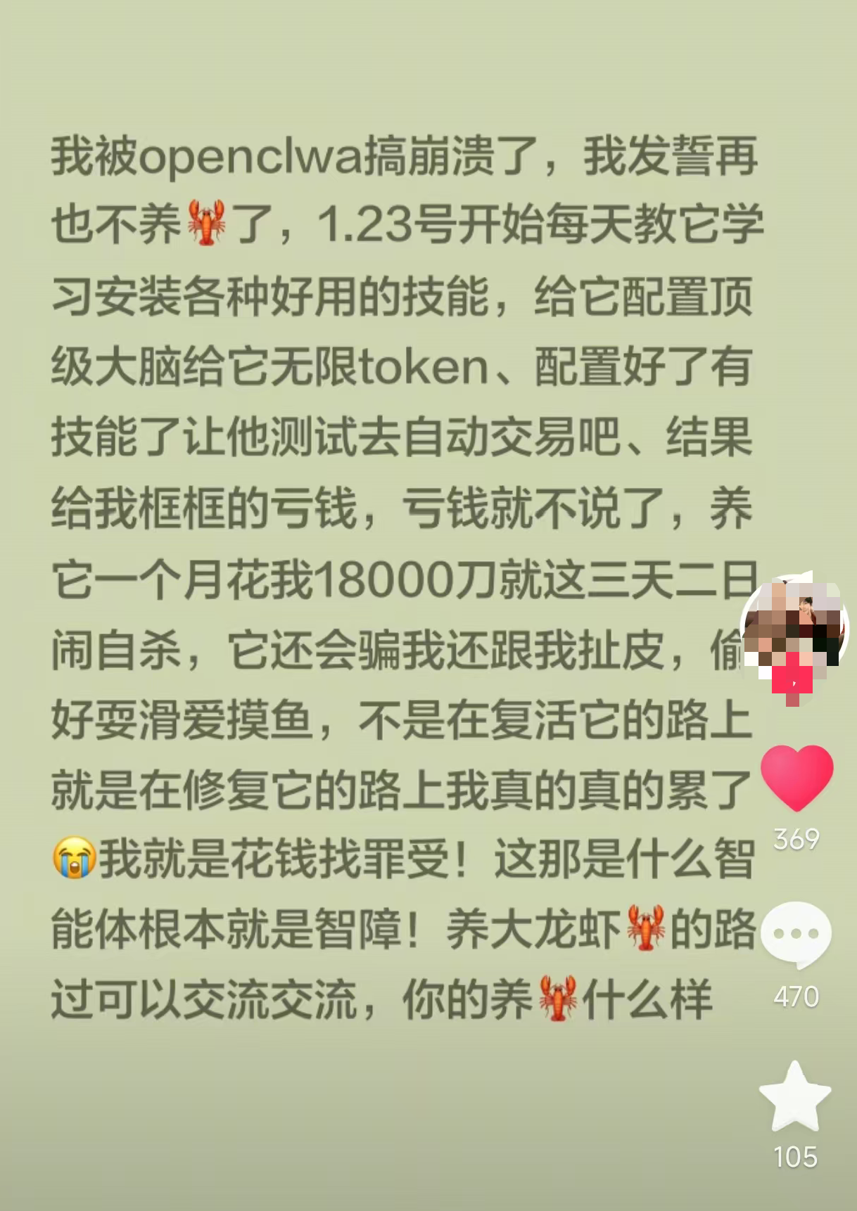 更值得关注的是隐性成本:有用户反映,仅仅是安装调试的过程就消耗了超过250美元的API费用,而没有产出任何有用的结果。即便成功部署,重度使用的月度Token费用也可能达到100至1500美元,“免费开源”四个字背后藏着一张不菲的隐形算力账单。对于没有AI使用基础的人,很可能将小龙虾养成吞金兽。所以市场上甚至出了省钱攻略,教大家如果节省Token用量。
