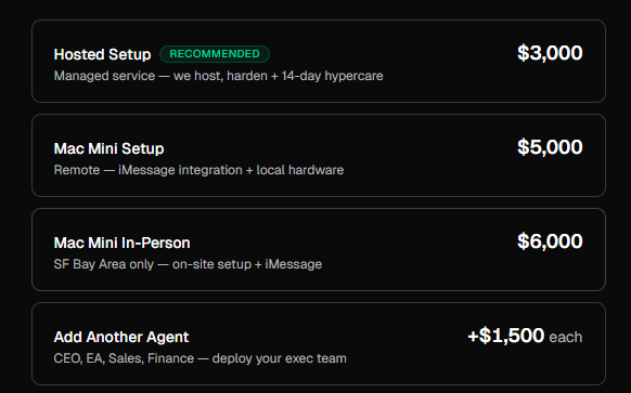 还有一条容易被忽略的暗线是硬件需求。OpenClaw推荐本地部署的消息,直接拉动了对算力设备的需求。海外代装平台SetupClaw的收费从3000到6000美元不等,其中往往包含对特定硬件配置的“推荐”引导。这条产业链的运转逻辑与20年前小灵通催生基站建设、带动整条电信设备产业链的故事,在结构上高度相似。