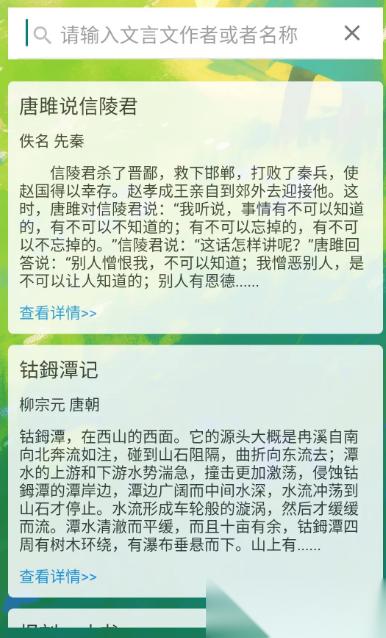 《古文典籍》堪称移动端的古典文库,收录了大量名家诗作与典籍文献。每篇作品都配有白话翻译、详细注释和背景解析,是系统学习古代文学的优质平台。