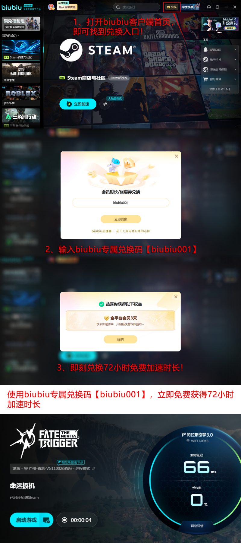 当前Biubiu加速I器面向新用户提供双重福利:注册即赠24小时免费加速时长;输入兑换码biubiu001,可额外获得三天免费使用权,新老用户均可参与。两项权益叠加使用,最高可享96小时连续加速服务。