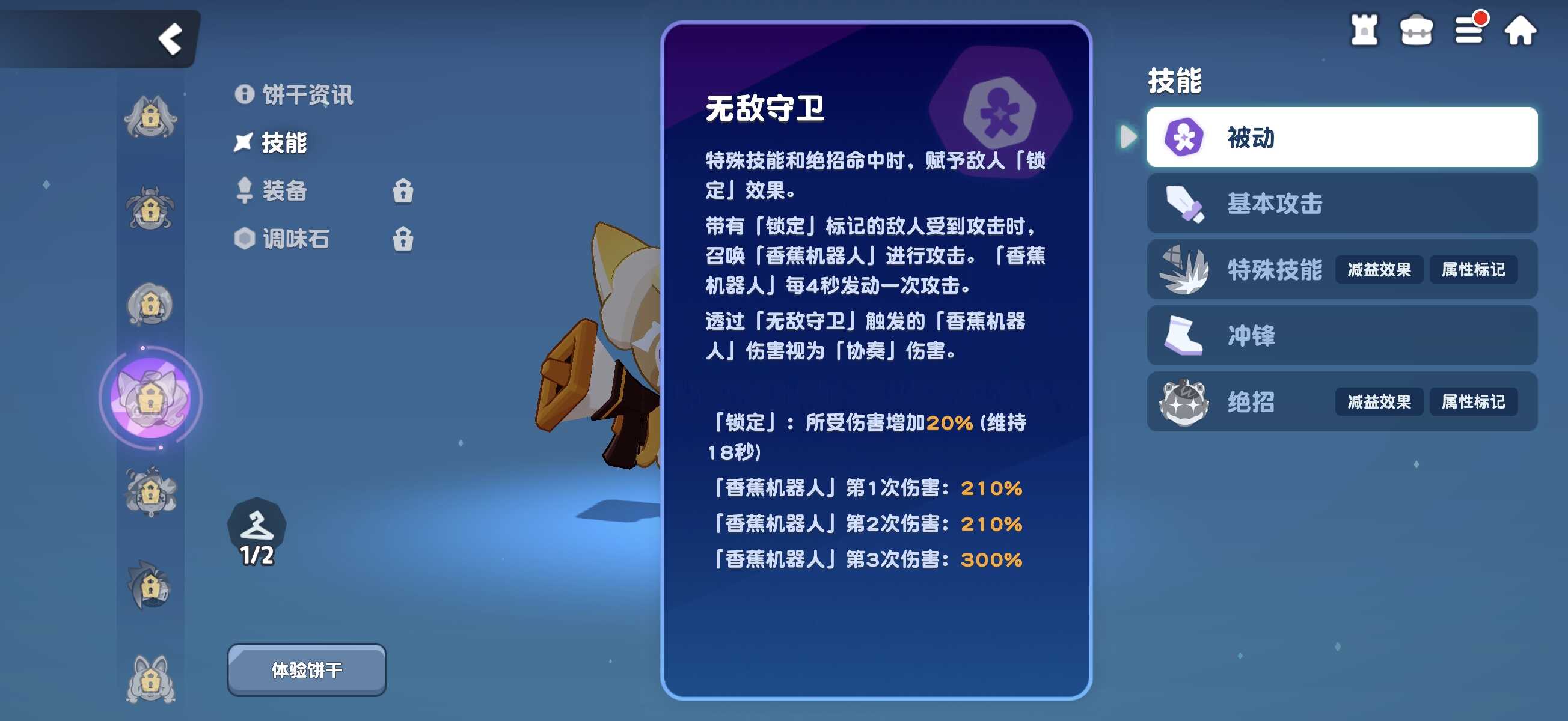 香蕉煎饼饼干在职业分类中归属打击型辅助输出角色,其核心优势不在于自身直接伤害,而在于通过多层机制持续触发协奏类伤害。该角色拥有专属被动“无敌守卫”,可使普通攻击第四段、蓄力普攻及绝招命中时对目标施加“锁定”状态;被锁定单位不仅承受额外持续伤害加成,还会在每次受击时召唤香蕉机器人进行协同攻击。该机器人每4秒自动发动一次普攻,所造成伤害统一归类为协奏类型,独立于角色本体伤害计算体系。