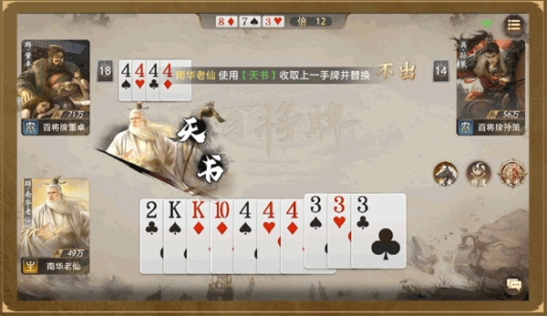 所谓“三生万物”,轮到南华老仙压牌时,若需要压的牌为X张,可发动【天书】技能打出(X-1)张【3】,收取这手牌。需要注意,X必须≥2且不能收取王炸。