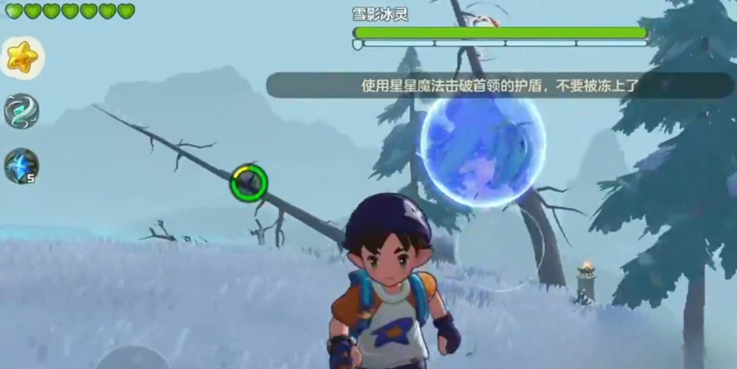 雪影冰灵盘踞于风眠雪山右上区域。战斗第一阶段以高密度冰刺突袭与天降巨型冰锥为主要威胁,地面红色预警范围清晰可辨;玩家需持续横向位移规避,并以远程魔法高频压制其弱点。进入第二阶段精灵对战后,火系精灵具备显著属性优势,尤其高输出火神类精灵可快速瓦解其冰属性抗性,大幅压缩战斗时长。