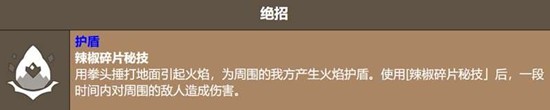 辣椒碎片饼干的绝招“辣椒碎片秘技”是其另一个重要的团队辅助手段。发动时,辣椒碎片饼干会猛击地面,引发火焰冲击,为范围内的所有队友施加一个强力的火焰护盾。