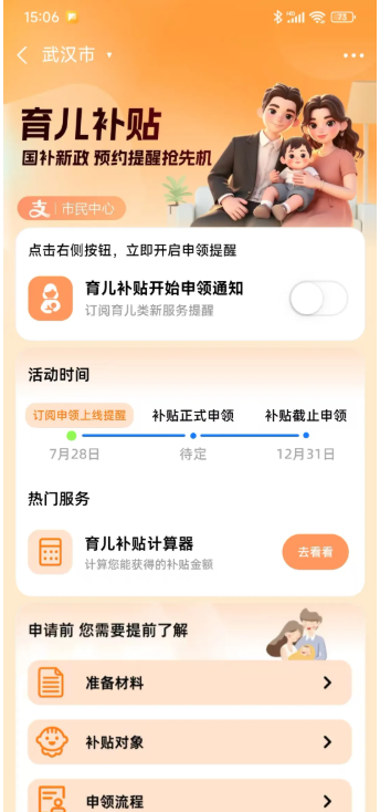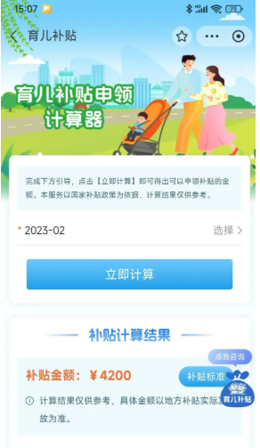使用内置计算器选择婴幼儿出生日期即可预估补贴金额