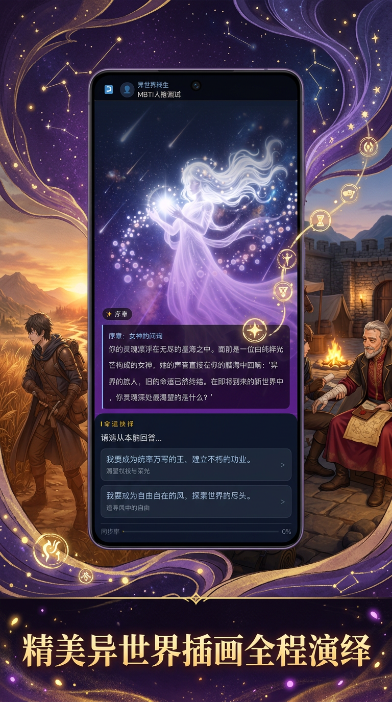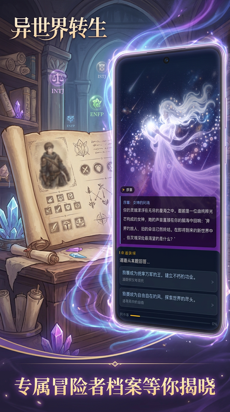 《异世界转生:MBTI人格测试》是一款融合轻小说叙事与心理学测评机制的互动式文字冒险游戏。玩家将扮演一名意外穿越至奇幻世界的主角,在女神引导下开启多线程人生旅程。全程无需复杂操作,仅通过简洁明了的选择即可推动剧情发展,适合各类休闲玩家轻松上手。