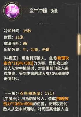 若承担队伍主C职能,蛮牛冲撞值得优先投入。该技能提供120%物理攻击力的基础伤害,并随暴击率提升同步增强最终伤害。其30%概率触发的击倒效果,虽非稳定控制,却可作为爆发链的启动节点——在BOSS转阶段或虚弱期衔接高伤技能,显著提升瞬时压制力。