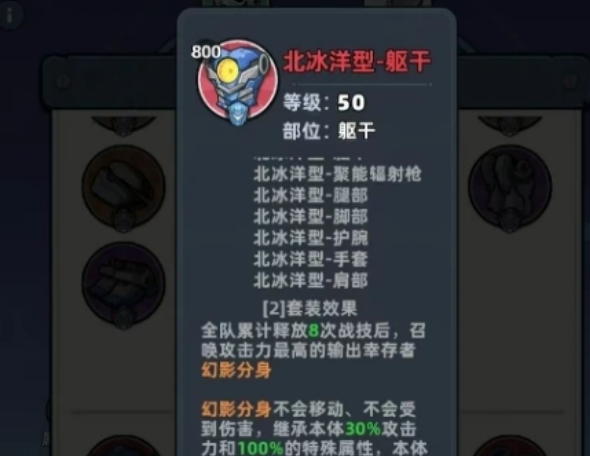 套装协同方面,经实测验证,“北冰洋6件套+擎天行2件套”为当前最优解。北冰洋套装可召唤持续20秒的幻影分身,分身完全继承本体伤害属性及特殊效果,且在本体释放战斗技能后,有50%概率重置技能冷却时间,保障高频触发循环;配合外骨骼钻头的层数叠加机制,可快速堆满10层并持续输出,显著放大整体DPS上限。