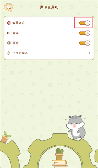 3、在声音设置界面找到【背景音乐】选项,将后面的开点击一下变成关即可。