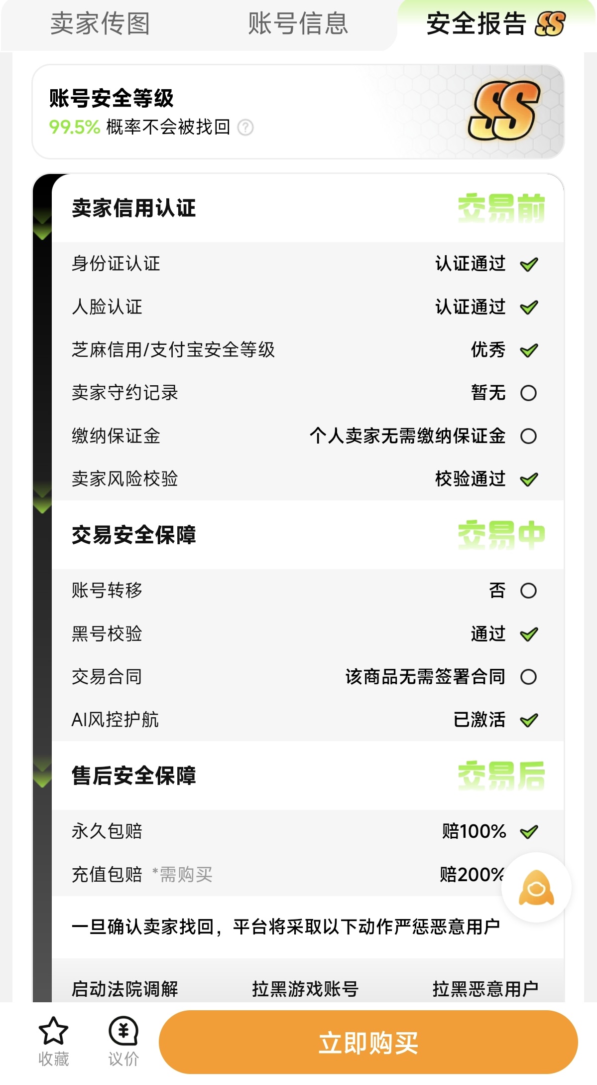 账号安全并非单一功能所能承载,而是贯穿交易全生命周期的闭环管理。构建了覆盖“交易前—交易中—交易后”的三段式防护链:交易前,所有上架2K账号均标注清晰的安全等级标识(如S级、A级),等级越高代表实名认证完备、登录设备稳定、历史无异常操作,建议优先选择S级账号;卖家须完成人脸识别+银彳卡双重实名,并对高信用卖家设置保证金缴纳机制;存在违规记录者将被系统自动限制发布权限,有效净化交易环境。