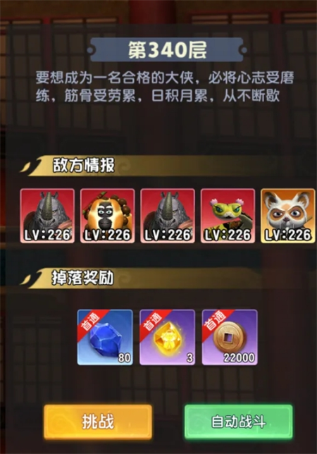 功夫熊猫神龙大侠游戏里爬塔玩法分三类为圣火塔(通用)、四色圣兽塔(花色限定)、圣火塔(高级),是获取淬炼石、战魂、紫色气功、装备材料的核心渠道。以下是爬塔玩法的具体讲解。